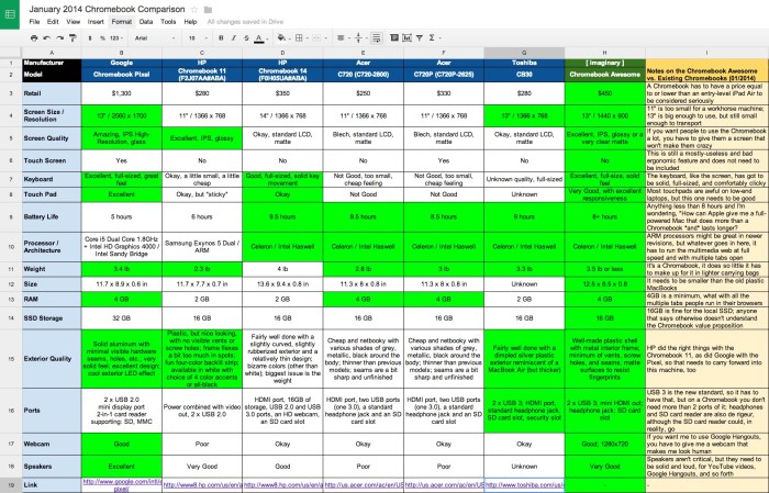 In the next-to-last column on the comparison spreadsheet I’ve included what I call the Chromebook Awesome. This is the Chromebook that gathers all the best elements of the other Chromebooks and makes a proper machine. It’s more expensive than the rest at an estimated $450 (except the Pixel, of course), but it fixes everything that’s broken with the other models. In reality, it’s a better Chromebook than the Pixel because it’s accessible to a broad audience, and it’s got everything needed for a very good cloud-based and Google-based experience.