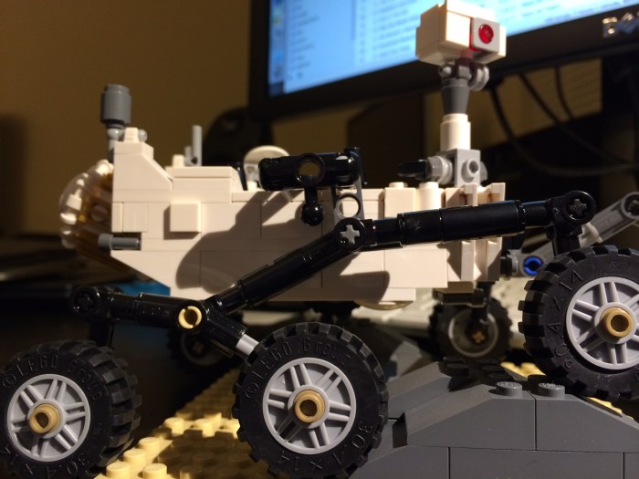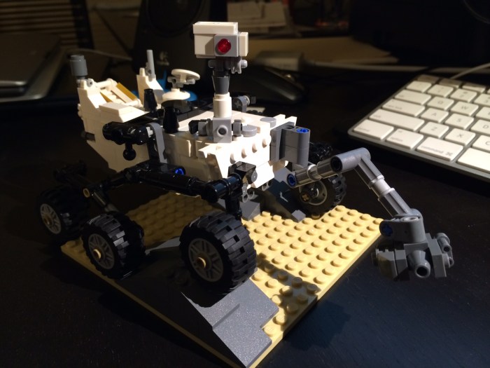 On thing’s for sure — this thing would not survive a trip to Mars (about 140 million miles, on average). It’s fairly delicate, with spindly arms and legs and protruding parts that are plastic stand-ins for the various sensors and tools on the real rover.