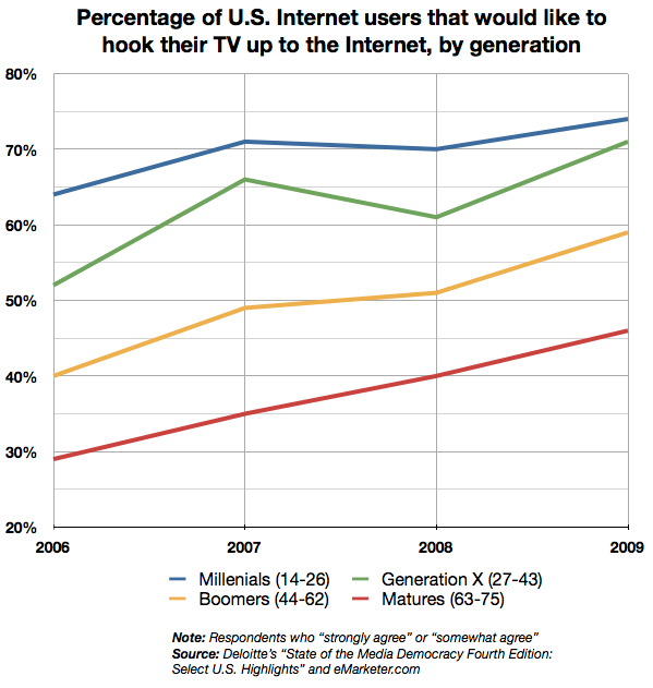 It’s remarkable to note how fast and consistently “matures” are getting interested in hooking their TVs up to the Internet. But everyone’s desires are rising, in all age ranges.