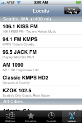 AOL Radio is pretty simple. It’s direct, live streaming access to the “AOL Radio” channels of music, sort of like satellite radio in that they aren’t local broadcast stations and are organized around tons of musical themes/styles. But it’s also an application that grants streaming access to hundreds of local terrestrial stations in the CBS collection. I can now listen, on the iPhone (with a live WiFi signal) to real-time streams of radio stations from coast to coast.